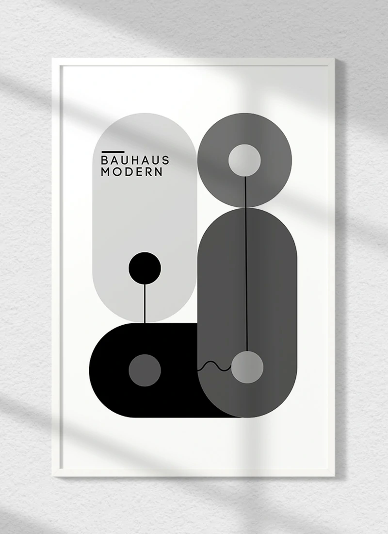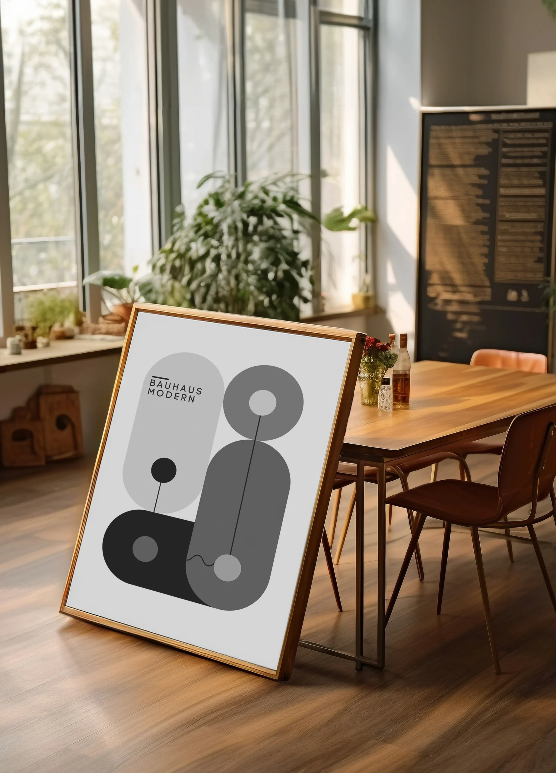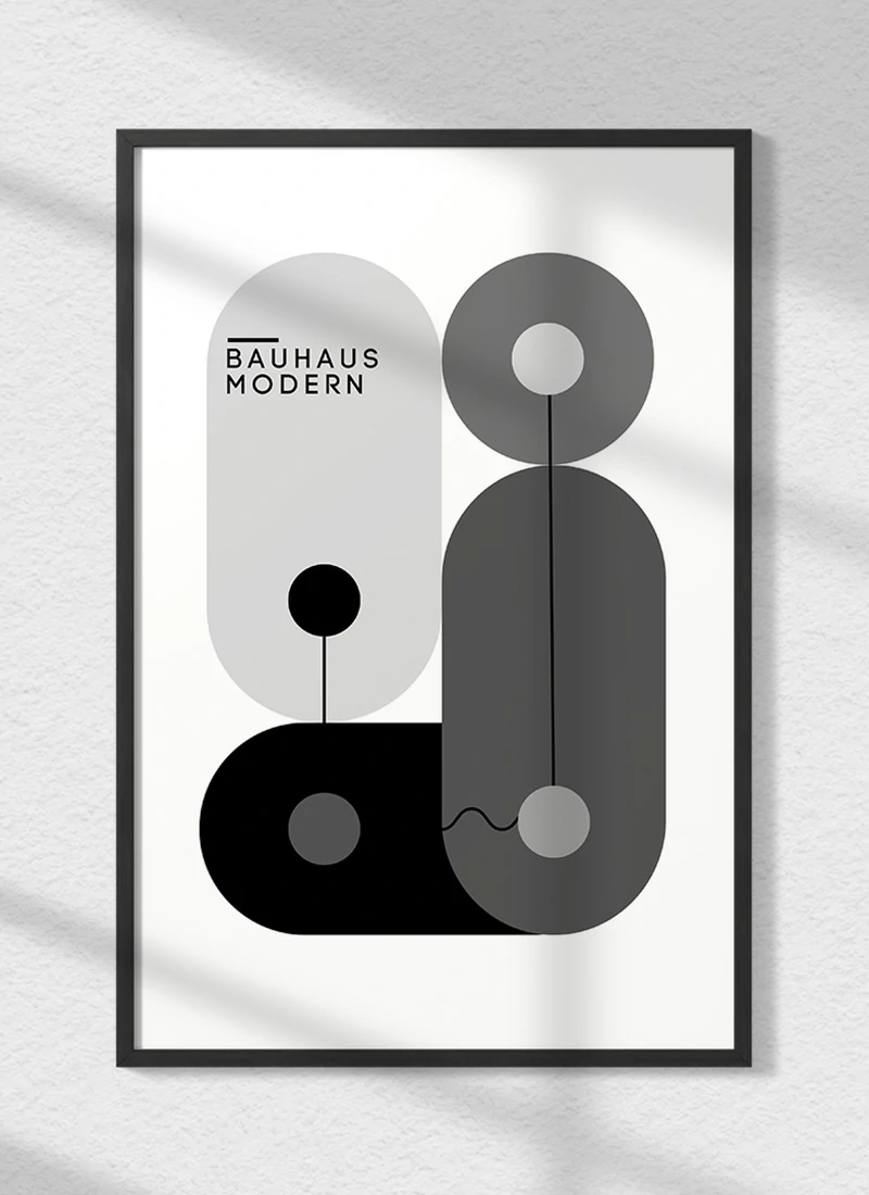 Diseño elegante y geométrico, este póster refleja la esencia del movimiento Bauhaus. Inspirado en la simplicidad y funcionalidad, combina líneas nítidas, formas vibrantes y una paleta moderna. Ideal para quienes aprecian la unión de arte y diseño, añade un toque vanguardista y atemporal a cualquier espacio.